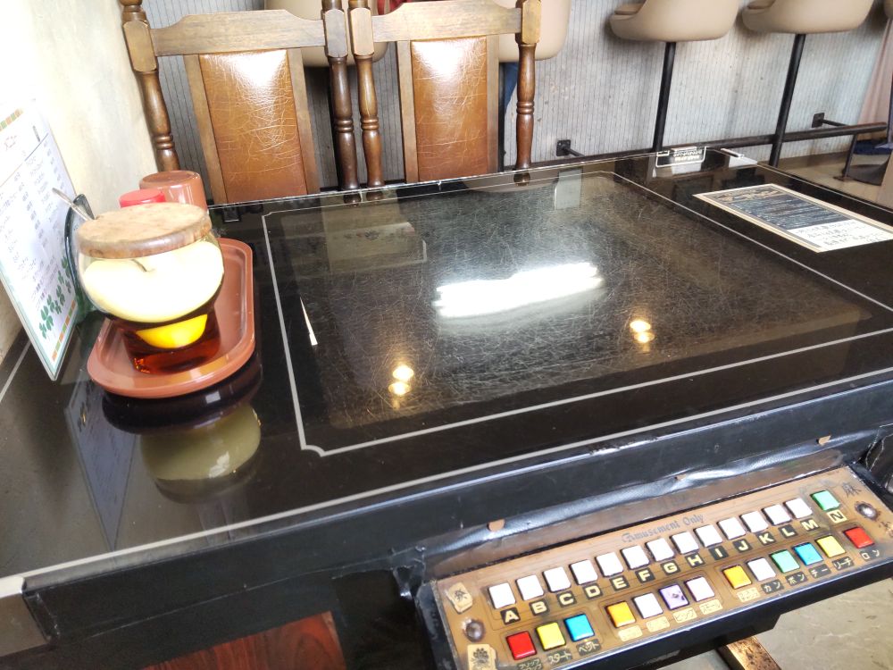 昭和レトロ感あふれるテーブルゲーム。現在はテーブルとして来る人を和ませている。