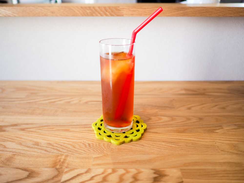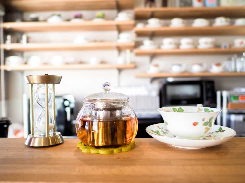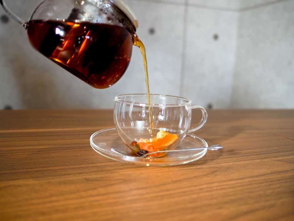 廣瀬さんこだわりの透明ガラスカップ&ソーサーに注がれるフルーツティーは、色とりどりのフルーツが浮かび、店内の落ち着いた雰囲気とも相性抜群。