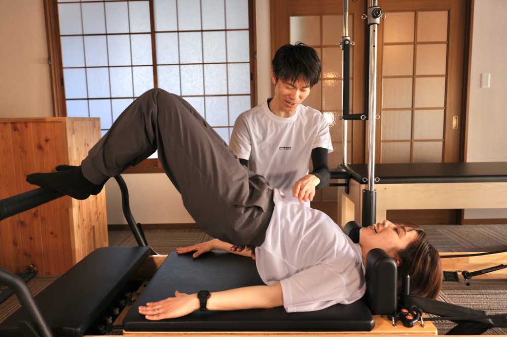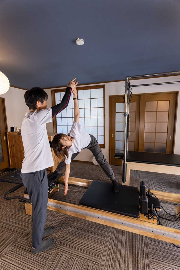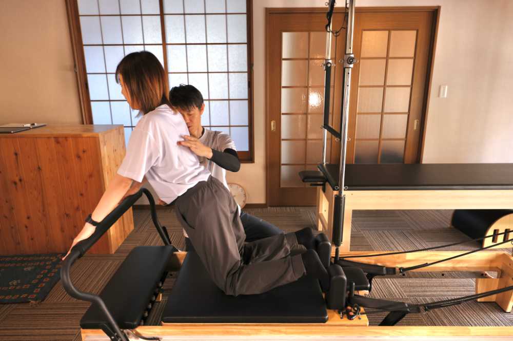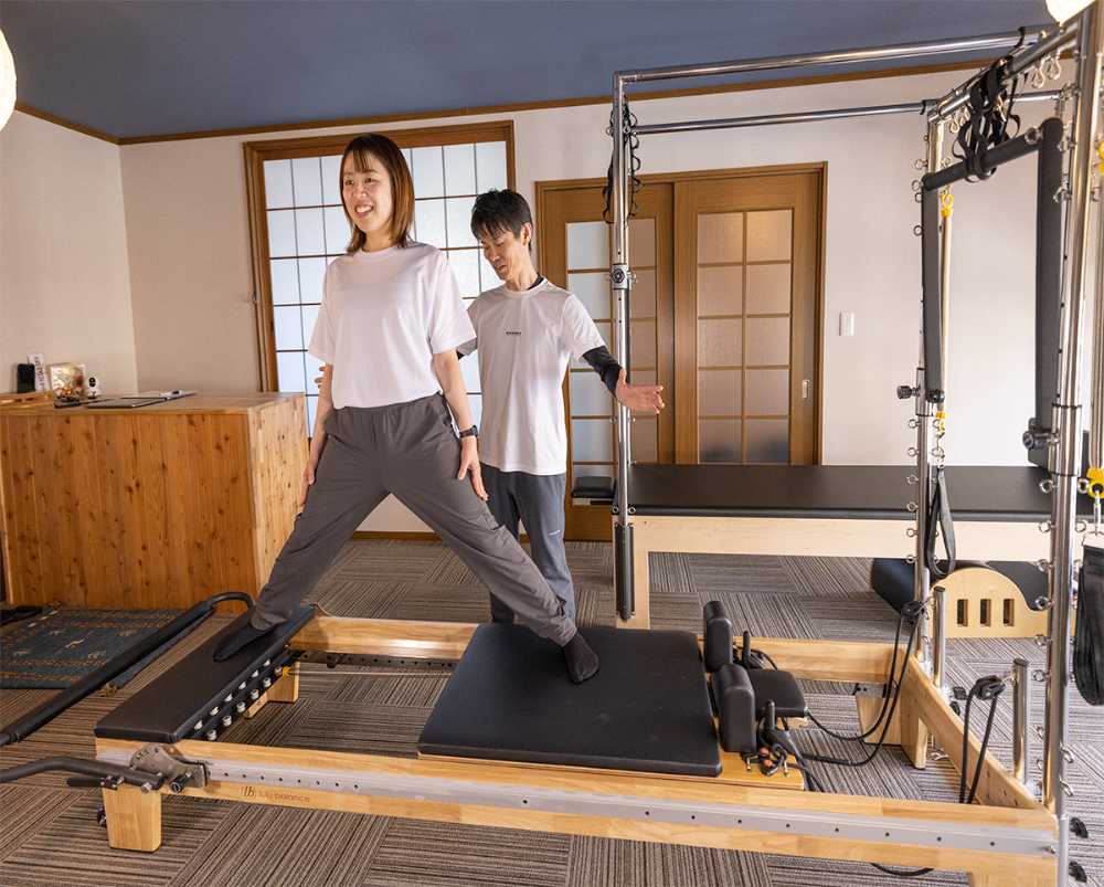 ピラティスマシンを用いた全身運動と、自宅で続けられる自主トレを組み合わせ、からだ本来の動きと十年先の健康を支えるからだ作りに取り組んでいる。