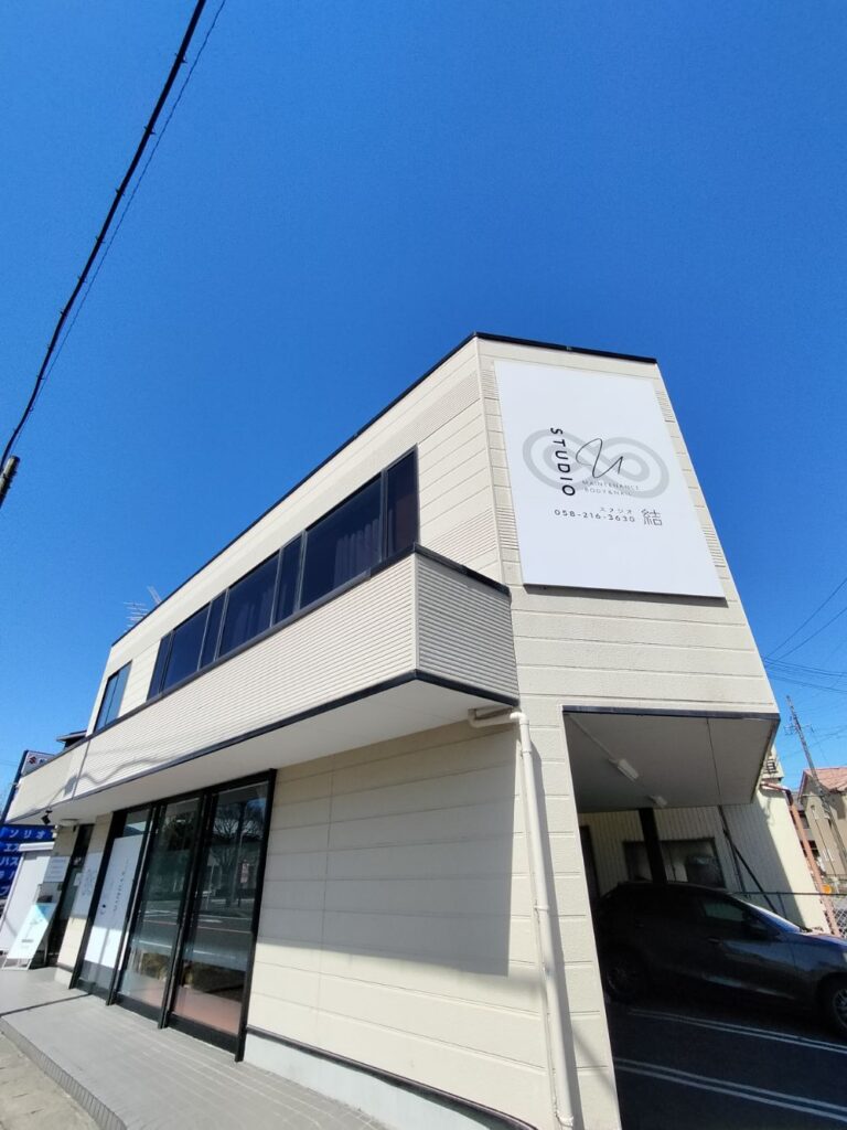 岐阜市旦島中、尻毛橋を岐阜市へ渡った交差点の近くに位置する「STUDIO結(ユウ)」。二階建ての建物の前には駐車場が並ぶ。